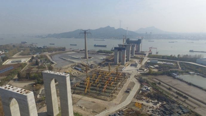 五峰山長江特大橋位于泰州長江大橋和潤揚長江大橋之間,其北岸位于鎮(zhèn)江市丹徒區(qū)高橋鎮(zhèn),南岸位于鎮(zhèn)江新區(qū)五峰山腳下,是連鎮(zhèn)鐵路和京滬高速公路南延的關(guān)鍵控制性工程。大橋全長6409米,其中主跨為1092米,采用單跨懸吊鋼桁梁懸索結(jié)構(gòu),上層為8車道高速公路,設(shè)計速度每小時100公里;下層為4線高速鐵路,設(shè)計速度每小時250公里。