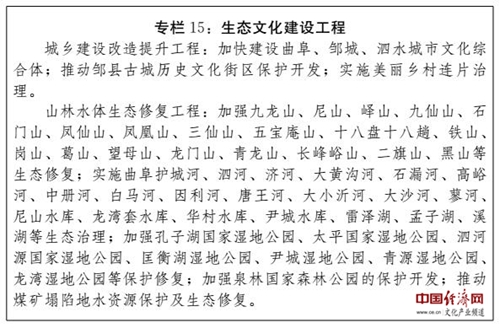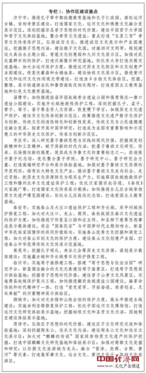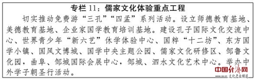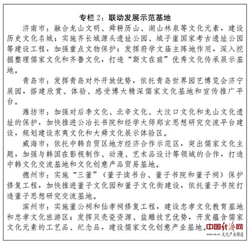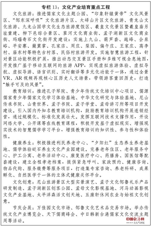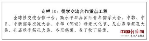 (四)建設全國文化經濟融合發展示范區。充分發揮文化引領、滲透和支撐作用,系統推進文化資源開發,強化文化品牌載體功能,推進文化與相關產業深度融合,大力發展文化產業,提升文化產業園區、特色基地建設水平,在更高層次上打造享譽國內外、彰顯儒家文化永恒魅力的旅游休閑圣地、教育培訓基地、健康養生福地和文化創意高地。
