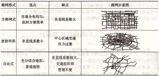 物流園區的路網結構是指園區道路形成的骨架形式(幾何圖形)。園區道路網結構可以建設為方格形、放射環形、自由式3種類型,具體特點和使用條件如表所示。