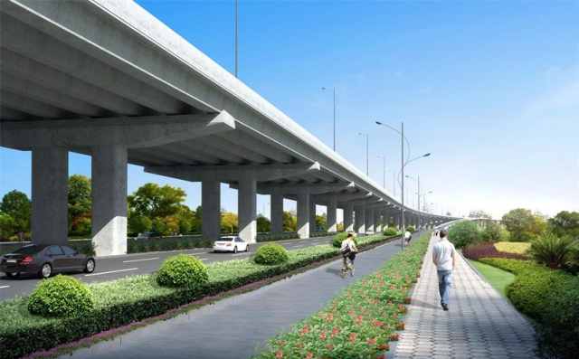 該快速路主線與鏡水路立交銜接,采用高架形式自西向東先后跨越大越路、綠云路、解放路、中興大道、越東路,二期工程延伸至越興路。 另外, 保留現狀鏡水路立交、大越路輔道立交,并新增綠云路和越東路2處全互通立交,沿線設置6對上下坡匝道與地面道路銜接。