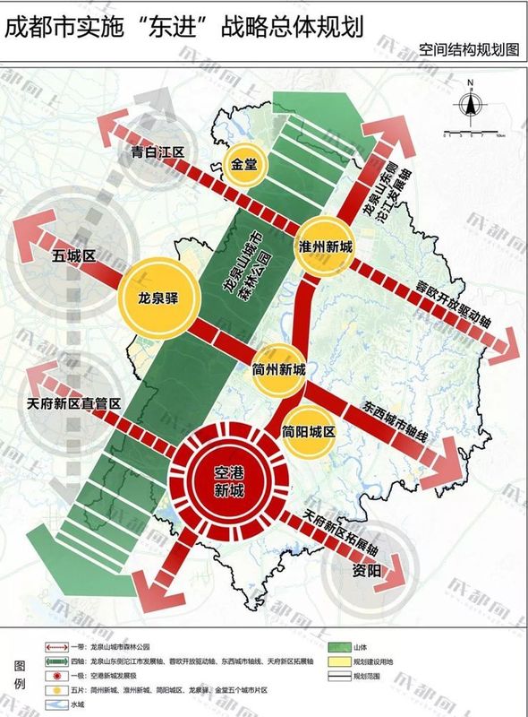 今年,在龍泉山城市森林公園規劃后,東進區域范圍有所調整,涵蓋金堂縣、簡陽市全域、龍泉驛區車城大道以東區域以及青白江區、天府新區直管區位于龍泉山森林公園范圍內的區域(共涉及7個鄉鎮),總面積為3976平方公里。