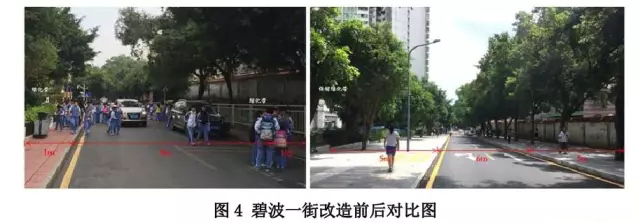 ● 碧波一街:原雙向車道機動車道寬度從米壓縮為米,利用兩側消極的綠化帶,將兩側人行道寬度從米加寬到米。