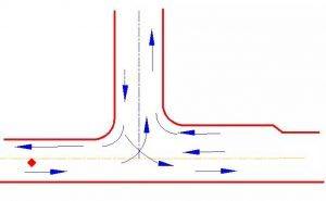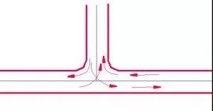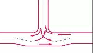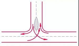 若無左轉(zhuǎn)彎車輛,四路交叉的沖突點由原來的16個減至4個。