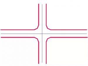 主要公路與次要公路(為縣鄉(xiāng)公路或三、四級公路)且轉(zhuǎn)彎交通量大的十字交叉,可采用該型式。
