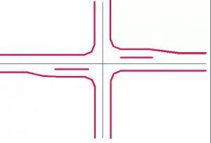 右轉(zhuǎn)車道:在進道口右側(cè)或同時在出道口右側(cè)擴寬