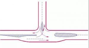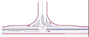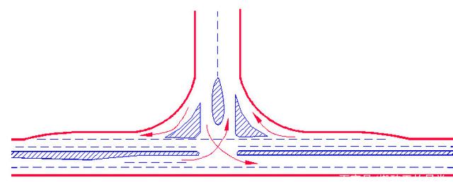 主要公路與次要公路的T形交叉,當轉(zhuǎn)彎交通量較大而會導致直行車輛的過分減速時,應采用加寬式T形交叉左轉(zhuǎn)彎交通量較大者,可采用該型式。