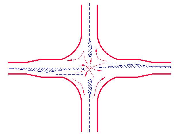 適當布置交通島限制行車路線,使車流按一定組織方式通過交叉口,把沖突限制在一定范圍內(nèi);
