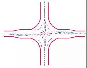 采用環(huán)形交叉(俗稱轉(zhuǎn)盤),使進入交叉口后的車輛按逆時針方向環(huán)繞中心島作單向行駛至駛出口,均以同一方向循序前進,消滅交叉口的沖突點。