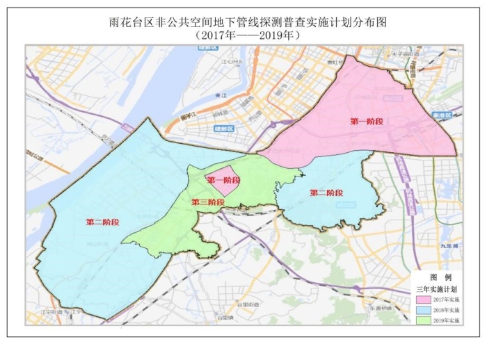 雨花臺區公共區域地下管線普查總長為3705公里。非公共空間地下管線總長度預估約為 4300 公里,于 2017 年 9 月啟動,分三年逐步實施,2019年12月底完成任務。