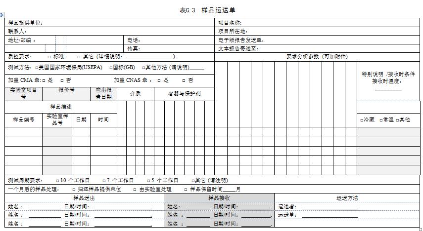 每份樣品從采樣到送至實驗室都應該有一個完整的樣品追蹤監管程序,主要包括:樣品的收集、運輸、處理和相關人員的信息;樣品采集日期、時間、深度等記錄數據;樣品分析項目等其他信息。樣品流轉清單樣式可參考表C.3。