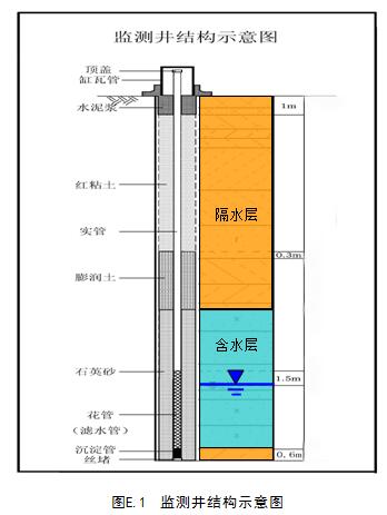 井管應由井壁管、過濾管和沉淀管等三部分組成。井壁管位于過濾管上,過濾管下為沉淀管。過濾管位于監測的含水層中,長度范圍為從含水層底板或沉淀管頂到地下水位以上的部分,水位以上的部分要在地下水位動態變化范圍內;沉淀管的長度一般為50cm~60cm,視隔水層的厚度而定,沉淀管底部須放置在隔水層內。地下水監測井示意圖見圖E.1。
