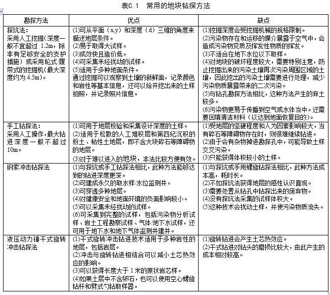 用于地塊環境評價的鉆探技術需結合地塊所在地區的地層條件、地塊鉆探的作業條件和地塊勘察的方案要求來選擇經濟有效的鉆探方法。表C.1列出北京市地塊環境評價中的常用的鉆探方法及其優缺點。