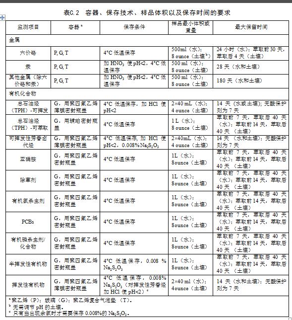 土壤樣品保存方式根據土壤樣品分析項目不同而不同,對無機物通常用塑料瓶或玻璃瓶收集樣品,揮發性和半揮發性有機物宜使用具有聚四氟乙烯密封墊的直口螺口瓶收集樣品。具體的土壤樣品收集器見表C.2。