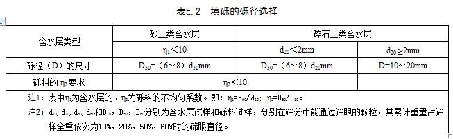 礫料的礫徑,應根據含水層顆粒篩分數據確定,可參照表E.2選用。