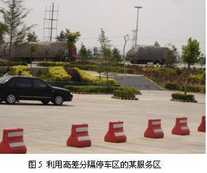 規劃應考慮按照不同車輛的停車要求將停車場進行合理劃分,較合理的劃分應該是:客車區、小轎車區、貨車及超長車區及特種車區。根據這四類不同車輛的不同要求,規劃停車區和牽出道,嚴禁客貨混停,防止超長車倒車停放。各區之間用綠島隔離,達到美化遮陽的效果;或者利用地形高差自然分隔,也可以防止不同類型車輛混停,這在我們調研中就有很好的一例(如圖5所示)。停車場可盡量做大,隔離島要少而小,避免影響停車和交通,要盡可能留有發展余地,所需土地可一次征用,分期擴建,初期可暫以綠地替代。