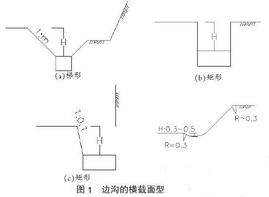 邊溝一般不需要進行水文和水力計算,可根據沿線情況,選用標準橫斷面形式.邊溝可采用三角形、流線形、梯形或矩形橫斷面(如下圖).底寬與深度都不應小于0.4m;農村公路受條件限制,需采用矩形斷面時,應盡可能在頂面加帶槽孔的混凝土蓋板,以防止生活垃圾或雜物堵塞邊溝.當采用梯形橫斷面時,邊溝內側邊坡坡度按土質類別采用1:1~1:1.5.