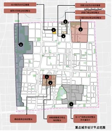 八個(gè)空間景觀節(jié)點(diǎn)包括:唱經(jīng)樓周邊地段、永興路歷史社區(qū)、拱極門周邊地段、鐘鼓樓復(fù)建及周邊地段、壩陵北街歷史地段、工程隊(duì)舊址周邊地段、五一廣場周邊地段及文道設(shè)計(jì)、城西水系周邊地段。
