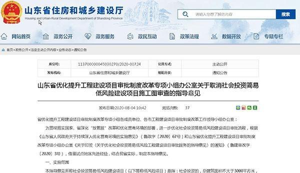 據山東省住房和城鄉建設廳網站,近日,山東省優化提升工程建設項目審批制度改革專項小組辦公室發布《關于取消社會投資簡易低風險建設項目施工圖審查的指導意見》,內容如下。