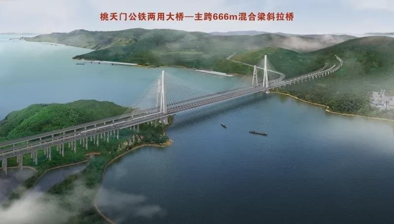 ,均為公鐵兩用,在同一平面布置了雙線鐵路及雙向六車道高速公路。其中,西堠門(mén)大橋采用斜拉懸索協(xié)作體系,主跨達(dá)1488米,建成后將是世界同類工程中跨度最大的公鐵合建橋梁;桃夭門(mén)大橋?yàn)榉蛛x式混合梁斜拉橋,主跨達(dá)666米。