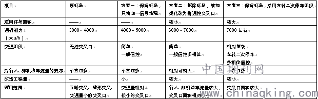 根據(jù)以上分析的環(huán)形交叉口可進(jìn)行的改造方案,對各個方案見進(jìn)行比較,結(jié)果如下表1。
