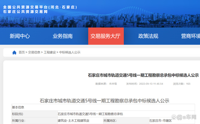 石家莊市城市軌道交通5號線一期工程設計總承包中標候選人公示