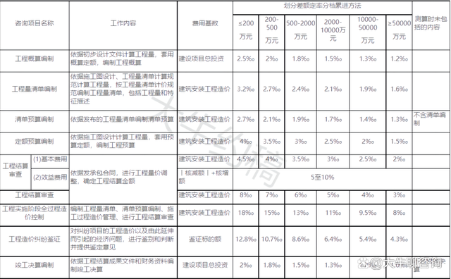 1.工程造價咨詢服務收費根據不同咨詢項目的性質、內容采取差額定率分檔累進方法計算;