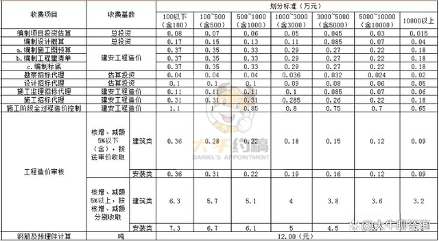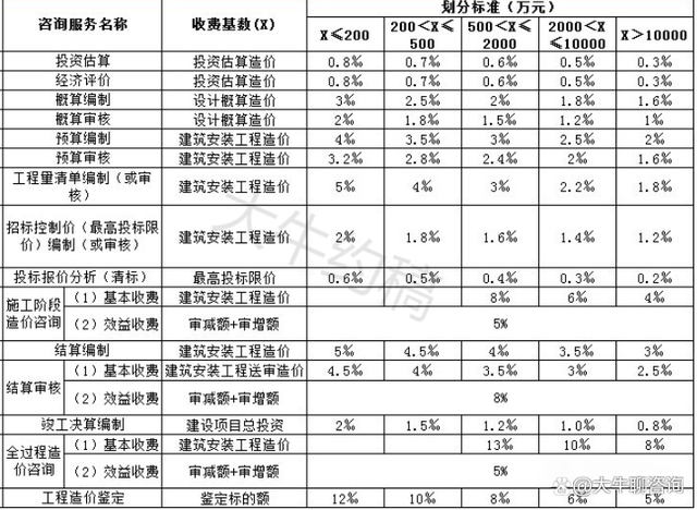 4.工程造價咨詢服務收費按照本標準計算收費,低于每項3000元的按3000收取,超出3000元時按本標準收取;