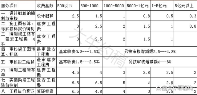 1.表中“工程預算、結算、決算審核、審計”項目的計費方式為(1)+(2);
