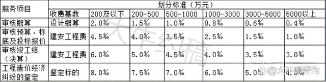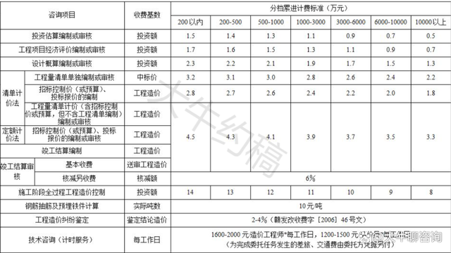 一、上表收費按差額定率分檔累進法計費。劃分標準為單項工程。當咨詢收費不足2000元時,按2000元收取;