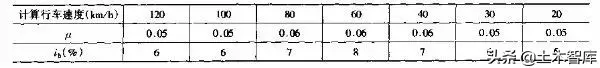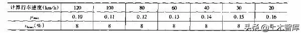 一般最小圓曲線半徑橫向力系數及超高橫坡度取用表