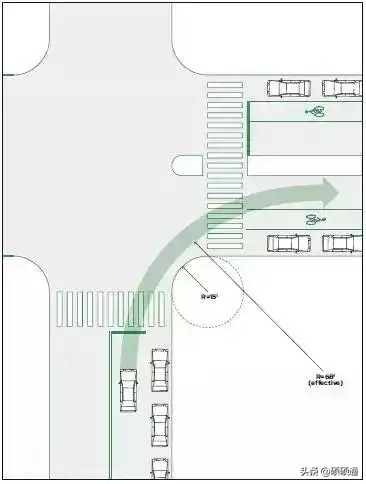 對小轉彎半徑的優勢也有明確的研究和定性:越小的轉彎半徑,對過街行人越有利。小轉彎半徑優勢明顯:①可以迫使機動車轉彎時降低車速減少事故;②有效縮小交叉口范圍,減小行人過街的距離;③增大步道在交叉口轉角空間的面積;④有利于交叉口處步道坡道的設置。