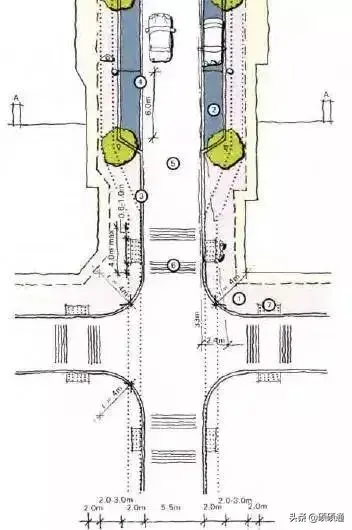 歐洲城市道路交叉口普遍采用較小的轉彎半徑,英國的《街道設計導則》明確提出城市道路交叉口轉彎半徑為4米。