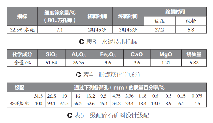 底基層:該路面結構底基層采用水泥粉煤灰穩定碎石,為減少半剛性基層材料層裂縫,需使用較高模量的水泥穩定碎石,而高模量的路面結構通常需使用較高劑量的水泥。但就半剛性基層材料自身的特性而言,高劑量水泥通常會使路面早期出現一定程度的干縮和溫縮裂縫。因此本文采用3%的32.5號水泥,同時結合摻加火力發電廠除塵裝置收集的粉煤灰,其水泥和粉煤灰技術指標如表3、表4所示。