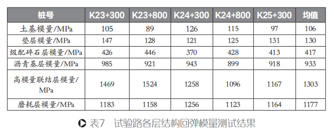 根據《公路路基路面現場測試規程》(JTG E60-2008),對試驗路各層施工完成后進行現場回彈模量試驗,其測試結果如表7所示。