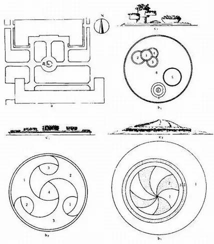 如圖5所示,為花壇圖紋構圖設計,圖中b2設計利用了4種植物材料,曲線優美富有動感,在運用動態韻律時結合漸變韻律、交替韻律共同表現。圖中b3設計利用3種植物材料,外環圍繞三種植物,且植物寬度不均衡,內部又運用曲線放射形動態設計,比較隨意、靈活,富有動感。