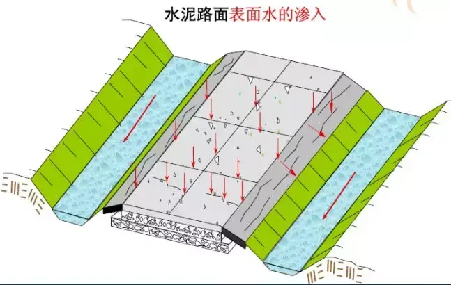 路面結(jié)構(gòu)內(nèi)部水的危害:浸濕各結(jié)構(gòu)層材料和路基土,易造成無粘結(jié)粒狀材料和地基土的強(qiáng)度降低;使水泥混凝土路面產(chǎn)生唧泥,隨之出現(xiàn)錯(cuò)臺(tái)、開裂和整個(gè)路肩破壞;進(jìn)入空隙的自由水在行車荷載的作用下,會(huì)形成高孔隙水壓力和高流速的水流,引起路面基層的細(xì)顆粒產(chǎn)生唧泥,結(jié)果失去支承;在冰凍深度大于路面厚度的地方,高地下水位會(huì)造成凍脹,并在凍融期間降低承載能力;水使凍脹土產(chǎn)生不均勻凍脹;與水經(jīng)常接觸將使瀝青混合料剝落,影響瀝青混凝土耐久性和產(chǎn)生龜裂。