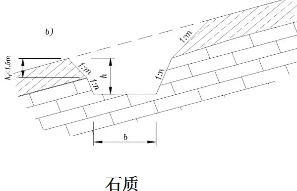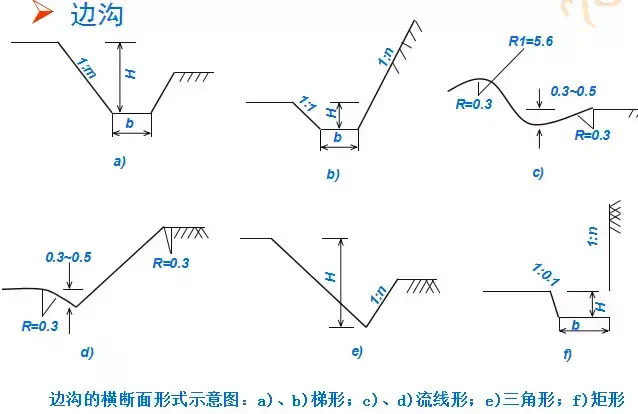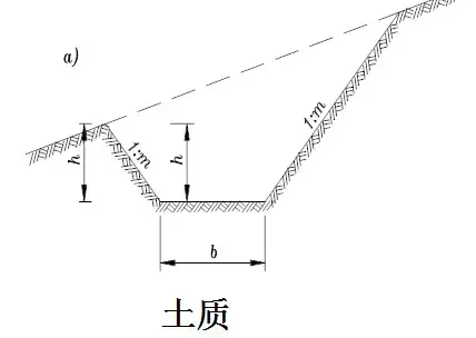 橫斷面:一般為梯形,溝的邊坡坡度,因巖土條件而定,一般采用1:1.0~1:1.5。溝底寬度b不小于0.5m,溝深h按設(shè)計(jì)流量而定,亦不應(yīng)小于0.5m。