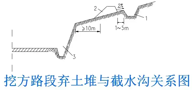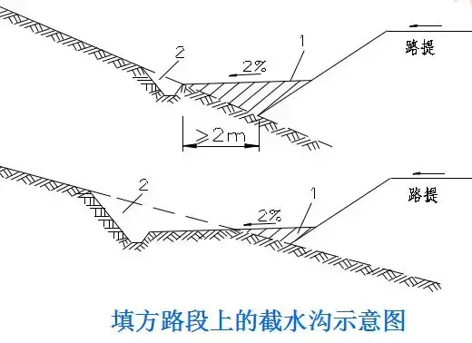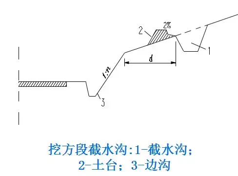 2.截水溝:又稱天溝,一般設(shè)置在挖方路基邊坡坡頂以外,或山坡路堤上方的適當(dāng)?shù)攸c(diǎn),用以攔截并排除路基上方流向路基的地面徑流。