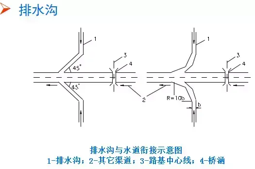 (3)排水溝水流注入其他溝渠或水道時(shí),應(yīng)使原水道不產(chǎn)生沖刷或淤積。通常應(yīng)使排水溝與原水道兩者成銳角相交,交角不大于45?,有條件可用半徑R=10b(b為溝頂寬)的圓曲線朝下游與其它水道相接。