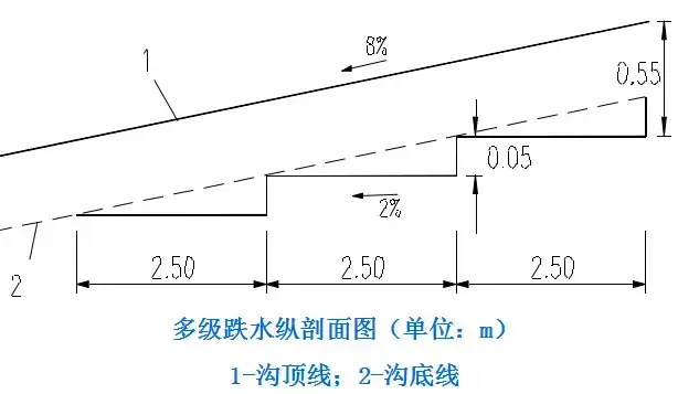 4.跌水與急流槽:跌水與急流槽是路基地面排水溝渠的特殊形, 用于陡坡地段,溝底縱坡可達(dá)45度。在陡坡或深溝地段設(shè)置的溝底為階梯,水流呈瀑布式跌落的溝槽稱作跌水。跌水的作用是在較短的距離內(nèi),降低水流流速,消減水流能量,進(jìn)而防止沖刷(用于坡度大于10%,水頭高差大于1.0m的陡坡地段)