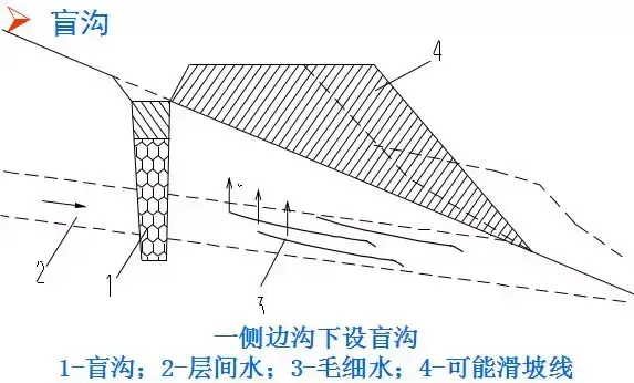 7.盲溝:相對(duì)于地面排水的明溝而言,盲溝又稱為暗溝,是一種隱蔽工程。在溝內(nèi)填以大小不同的顆粒材料,利用滲水材料的透水性將地下水匯集與溝內(nèi),并沿溝排泄至指定地點(diǎn)。