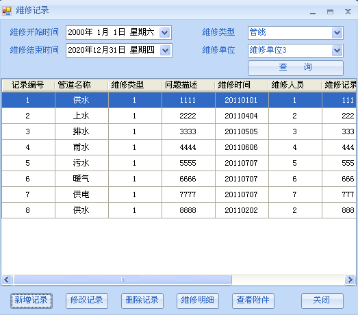 4.對各種管線的維護信息做到及時統計,使管理人員能及時掌握管線的運行情況,對管線進行動態維護和管理。 實現各種管線管理維護的績效分析(質量、效率、成本)。