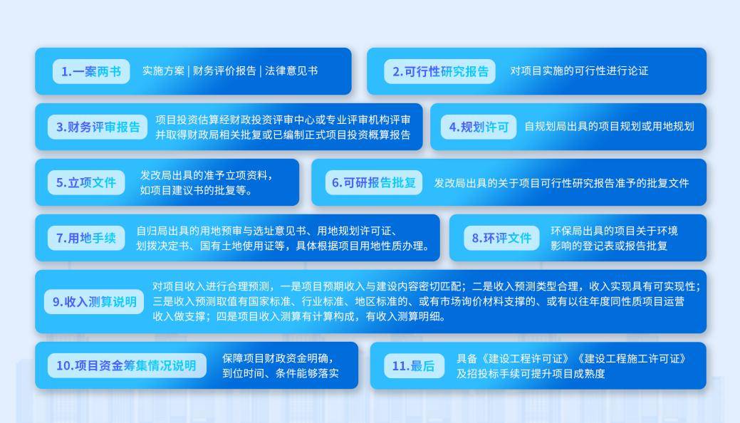 一是由專業機構撰寫的項目實施方案(具體包括項目概況、投資測算、收益測算、平衡分析和測算附表),切忌方案強行平衡;