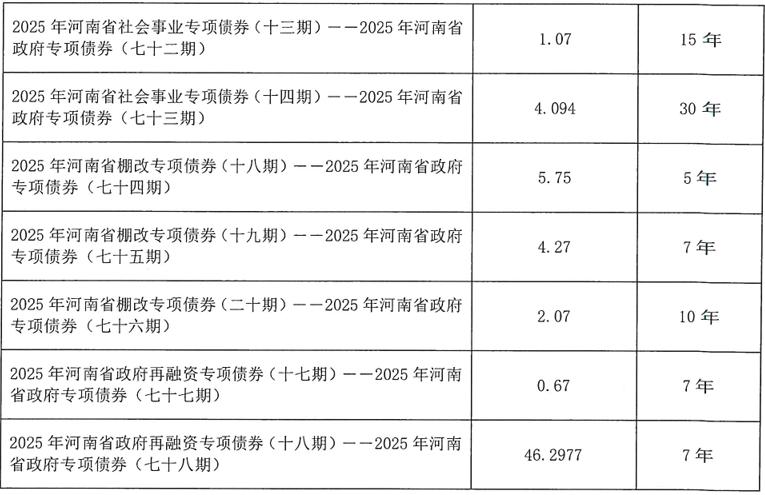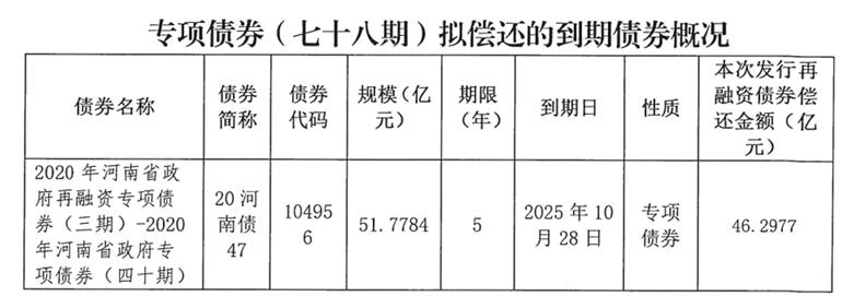2025年河南省政府專項債券(七十八期)擬發(fā)行金額46.2977億元,用于償還2020年河南省政府再融資專項債券(三期)-2020年河南省政府專項債券(四十期)的部分本金。